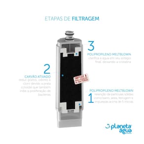 O sistema exclusivo de filtragem do Filtro Planeta Água é capaz de eliminar impurezas sólidas como barro, ferrugem, fungos e algas, além de eliminar odores e sabores indesejáveis da água.