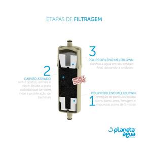 O sistema exclusivo de filtragem do Filtro Planeta Água é capaz de eliminar impurezas sólidas como barro, ferrugem, fungos e algas, além de eliminar odores e sabores indesejáveis da água.