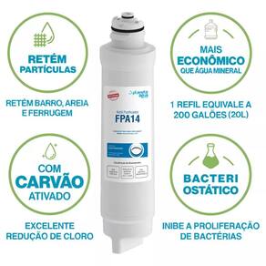 Dados Técnicos Código: 1162A Capacidade aproximada: 4000 litros Vazão: 60 litros por hora Faixa de operação: 29 a 392 kPa Faixa térmica: 1 a 40 °C Dimensões: 278 x 61 x 61 mm Massa: 352 g Composição: Polímero sintético, elemento filtrante interno e anel de vedação Aplicação: Ponto de uso (POU)