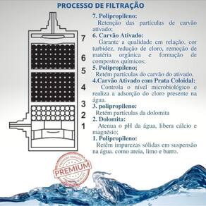 Retenção de partículas: classe d Redução de cloro livre : atende aos parâmetros da norma vigente Nível microbiológico : atende aos parâmetros da norma vigente Extraíveis : atende aos parâmetros da norma vigente Eficiência bacteriostática : sim Vida útil : 3000 litros