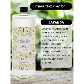 Lavanda: Fragrância fresca e relaxante, inspirada no bem-estar que a lavanda é capaz de oferecer. É uma combinação elegante e sedutora. Lavanda Fougére, com nuance gourmet de baunilha americana e leve toque de ervas frescas, são esses ingredientes que passam pelo processo de maceração, que garante a pureza das notas olfativas.