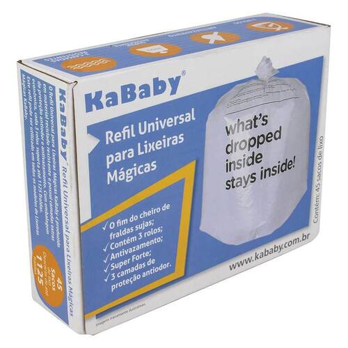 Os sacos Refil Universal Para Lixeiras Mágicas são os mais apropriados para sua lixeira mágica. Este conjunto dispõe de 45 unidades de tamanho universal, elaboradas com 3 camadas de material super resistente, anti vazamento e anti-odor. O Refil Universal Para Lixeiras Mágicas da Kababy contribuirá para a manutenção e preservação dos ambientes a todo tempo.Informações do Produto: