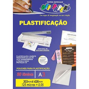Plástico para plastificação Off Paper Contém 50 lâminas Tamanho: A3 Medida 303x426mm Plastificação: Quente/Frio Resistente ao calor, Alta transparência, À prova d'água e tem Proteção UV