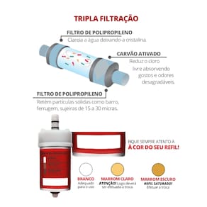 Refil para purificador de água com três processos de filtração. Utiliza carvão ativado com prata para eliminar cloro, odores, gostos, sujeira, areia, barro e ferrugem. Proporciona água cristalina e pura. Alta vazão de filtração. Economia ao evitar a compra de galões.Tipo