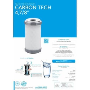 Refil com carvão ativado natural, 3 etapas de filtragem, absorve cloro, retira sabores, reduz substâncias químicas e orgânicas, retém partículas acima de 5 micras, bacteriostático.Tipo