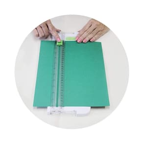 Refiladora de papel pequena e prática para cortes precisos, feita de plástico, com lâmina e régua de 32cm, podendo cortar até 5 folhas de uma vez.