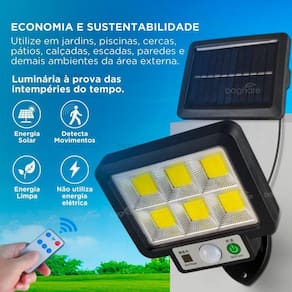 Especificações: - Fonte de energia: Raios Solares - LED: 160 Cob - Potencia de iluminação: 32 Watts E 1250 Lumens - proteção em Nível: IP65 - Distância de detecção: aproximadamente 5 m - Autonomia de iluminação: 3h a 4h em luz constante e 10h utilizando sensor de movimento em locais pouco movimentados. - Tempo Ligada ao detectar movimento: aproximadamente 20 Segundos Tempo renova a cada novo movimento - Tempo de vida do LED e Bateria: 50000 h - Cor dos LEDs: Branco Frio - Tipo de instalação: Fixado Na Parede - Medidas da luminária: 12,9cm x 14x8cm x 3cm - Medidas da placa solar: 12,7cm x 11,3cm x 3cm - Sensor de movimento ângulo: 120º - Material: ABS