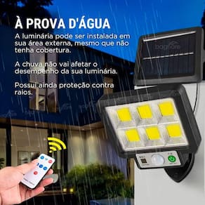 INCLUSO: Luminária Solar de 128 LEDs com controle remoto Para instalação: Parafusos + Buchas + suporte + fixador de parede Manual Marca: Bagnare Import Ean: 7890745613718