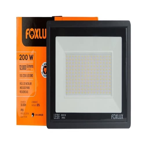 Especificações Técnicas Alimentação/Tensão Suportável: 100-240 V Potência: 200W Temperatura de Cor: 6.500K Fluxo Luminoso: 12000 lm IRC (Índice de Reprodução de Cor): > 80 Ângulo de Abertura: 120° Vida Útil: 30.000 horas Índice de Proteção: IP65 Frequência: 60Hz Temperatura de Operação: -10°C a 40°C Dimerização: Não compatível Cor: Preto