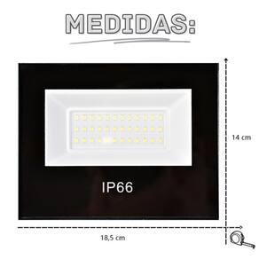 - potência: 100w - temperatura de cor: branco frio 6500k - modelo: slim - material: alumínio e vidro - carcaça: alumínio cor preta - vida útil estimada de até 50. 000 horas - luminosidade: 3750 lúmens - voltagem: ac100-240v bivolt - ângulo abertura: 120 - certificação: ce - proteção: ip66 - sendor de movimento: não - dimensões: 17 x 14 x 3 cm