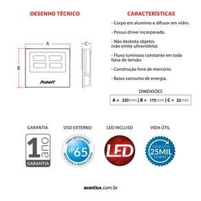 Informações Adicionais: Tamanho: 220x175mm Marca: Avant EAN: 7899825509750 Código Referência: Slim150 Código do Produto: 259651378 Cor: Preto Cor da luz: Branco Temperatura da Luz: 6500K Tensão: Bivolt Frequência: 60Hz Eficiência Luminosa: 75 lm/W Potência: 150W Vida Útil: 25 Mil Horas Validade: Indeterminado Índice de Proteção: IP65 IRC: >80 Garantia: 1 Ano