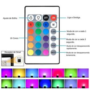 Manual rápido: - Procure um profissional especializado para a instalação. - Desligue a rede elétrica antes da instalação ou substituição deste produto. - Solte o lacre Fita transparente do controle remoto para sua operação - Liga On e Desliga OFF - Intensidade de brilho: Precisa segurar o botão para mudar a intensidade da luz - Flash: Mudança lenta de cores - Strobe: Mudança rápida de cores luzes piscando - Fade: Acende e apaga rapidamente as cores - Smooth: Acende e apaga suavemente as cores - Quando for ativado algum efeito, precisando desativar é somente acionar quaisquer um dos botões de cores do controle - Quando o controle parar de funcionar a bateria modelo CR2025 deverá ser substituída