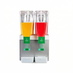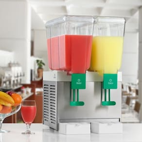 Refresqueira com 2 depósitos independentes de 15 litros cada, totalizando 30 litros. Estrutura em aço inox e depósitos em policarbonato cristal. Sistema de agitação por pá. Torneiras desmontáveis 'Easy Clean'. Pingadeiras removíveis.Água gelada