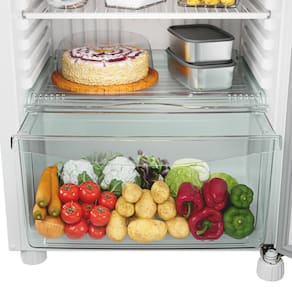 Capacidades Capacidade total líquida: 332 L Refrigerador: 258 L Freezer: 74 L Número de portas: 2 Posição do freezer: Em cima Desempenho e Controle Tipo de degelo: Manual (Cycle Defrost) Classificação energética: C (127V e 220V) Consumo: 29.3 kWh/ano Controle de temperatura interno: Sim Estrutura Prateleiras refrigerador: 3 (vidro, metal e plástico) Prateleiras reguláveis: Sim Gaveta: Gavetão de frutas e legumes Prateleiras freezer: 1 Porta-ovos removível: Sim (2 unidades, 12 ovos) Dreno de degelo: Sim Iluminação interna: Sim Dimensões e Peso Altura: 167.8 cm Largura: 60 cm Profundidade: 66 cm Peso: 59 kg Elétrico Voltagem: 127 V ou 220 V Tomada: 10A Plugue: 2 pinos Instalação (nicho) Largura: 65 cm Altura: 173 cm Profundidade: 71 cm Cor e Acabamento Cor: Branco Porta e gabinete: Pintado na cor Puxador integrado na cabeceiraVendido e entregue por Extra