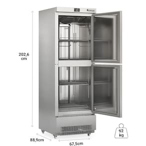Ideal para a conservação e exposição de frios, laticínios, bebidas e alimentos diversos não congelados e conta com sistema de refrigeração por ar forçado com evaporador aletado, microventilador eletrônico e degelo automático. Possui controlador eletrônico com display de temperatura, três prateleiras reguláveis, portas cegas com puxador embutido e fechamento automático. Sua estrutura robusta é construída em gabinete monobloco, com revestimento interno em aço inox 304 fosco e externo em inox escovado, além de resistência na moldura das portas e rodízios com trava que facilitam o deslocamento.