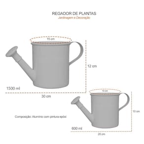 Contem: 1 Regador de 600 ml Medidas: 20 x 10 cm 1 Regador de 1500 ml Medidas: 30 x 12 cm Material: Aluminio com pintura epoxi