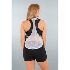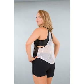Características Comprimento nas costas maior do que na frente Tecido em tela (mesh) na cor branca com faixas laterais preta Modelagem solta Cavas nas laterais Benefícios Respirabilidade Não retém suor Leve e confortável com elasticidade para livre movimentação Tecido tecnológico, não precisa passar ComposiçãoPoliamida e Elastano