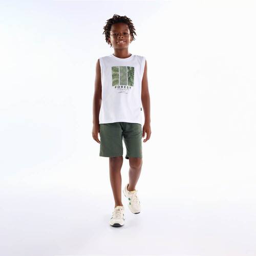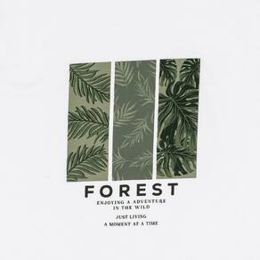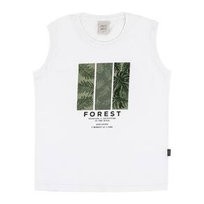 Para os dias mais quentes, regatas facilitam a transpiração e proporcionam conforto para os meninos curtirem o dia cheio de brincadeiras e diversão. Confeccionada em tecido meia malha na cor branca, a regata possuí decote redondo e estampa frontal de floresta com escrita *traduzida "floresta, desfrutando de uma aventura na selva, vivendo apenas um momento de cada vez"