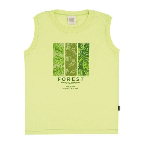 Para os dias mais quentes, regatas facilitam a transpiração e proporcionam conforto para os meninos curtirem o dia cheio de brincadeiras e diversão. Confeccionada em tecido meia malha na cor lima, a regata possuí decote redondo e estampa frontal de floresta com escrita *traduzida "floresta, desfrutando de uma aventura na selva, vivendo apenas um momento de cada vez"