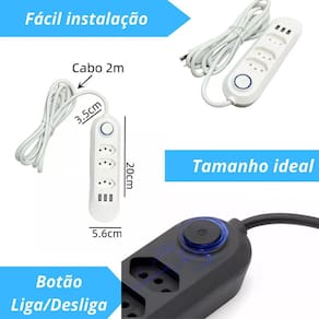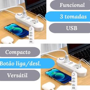Régua de 3 tomadas 3 usb para carregar celular univ 2 metros Descrição do anúncio: A régua elétrica com 3 tomadas e 3 usb bivolt é a solução ideal para quem busca praticidade e segurança no dia a dia. Com três tomadas universais e três portas usb 5v 2.1a , esta extensão oferece carregamento rápido e eficiente para diversos dispositivos. Seu cabo de 2 metros proporciona maior alcance, enquanto o design compacto e leve facilita o transporte e o uso em diferentes ambientes. Ideal para carregar celulares, alto-falantes usb, ventiladores usb e outros produtos térmicos usb, essa régua é perfeita para uso doméstico e pequenos escritórios. Conteúdo da embalagem: 01 x régua elétrica com 3 tomadas e 3 usb Características: 3 tomadas elétricas espaçadas, permitindo acomodar plugues grandes sem obstruções 3 portas usb para carregar dispositivos móveis como smartphones e tablets Design moderno e funcional, compacto e leve, fácil de transportar Proteção contra surtos elétricos e sobrecargas, garantindo a segurança dos aparelhos conectados Compatível com redes elétricas 127v/220v, funcionando como bivolt automático Fusível de proteção integrado para evitar danos em caso de picos de energia Cabo de extensão de 2 metros para maior alcance Especificações: Modelo: filtro de linha com 3 tomadas e 3 usb Material: plástico resistente Cor: branca transparente Compatibilidade: ideal para uso doméstico e pequenos escritórios Dimensões aproximadas: 30 cm de comprimento x 5 cm de largura x 3 cm de altura Principais perguntas sobre o produto e respostas: O produto é bivolt Sim, o produto é compatível com redes elétricas de 127v e 220v, funcionando como bivolt automático. Qual é o comprimento do cabo de extensão O cabo de extensão tem 2 metros de comprimento, proporcionando maior alcance. As portas usb são rápidas Sim, as portas usb têm uma saída de 5v 2.1a, garantindo carregamento rápido e eficiente. Esta régua possui proteção contra surtos elétricos Sim, o produto possui proteção contra surtos elétricos e sobrecargas, garantindo a segurança dos aparelhos conectados. Pode ser Utilizado para carregar dispositivos usb como smartphones e tablets Sim, as três portas usb são ideais para carregar dispositivos móveis como smartphones e tablets. O produto é leve e fácil de transportar Sim, o design compacto e leve torna a régua fácil de transportar e usar em diferentes ambientes. 4o Homologação Anatel: 101412208726