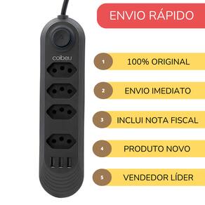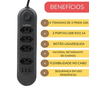 Características: * 4 tomadas de 3 pinos com 10A cada * 3 portas USB 5V/2.1A para carregamento de dispositivos móveis * Botão liga/desliga para controle fácil e seguro * Material retardante de chamas para maior segurança