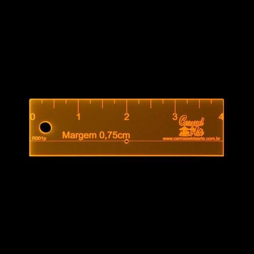 Régua Margem de Costura polegada Régua com margem de 7,5mm com furo para um perfeito alinhamento Tamanho da régua: 10x3 cm. Esta Régua facilita o corte e marcação precisos das margens a serem costuradas e cortadas. Ideal para Patchwork, Scrapbook. Marca: Carrossel da Arte Material: Acrílico Virgem Cor: Laranja fluorecente transparente Espessura: 3 mm Régua gravada a laser, que nunca vão ser apagadas.