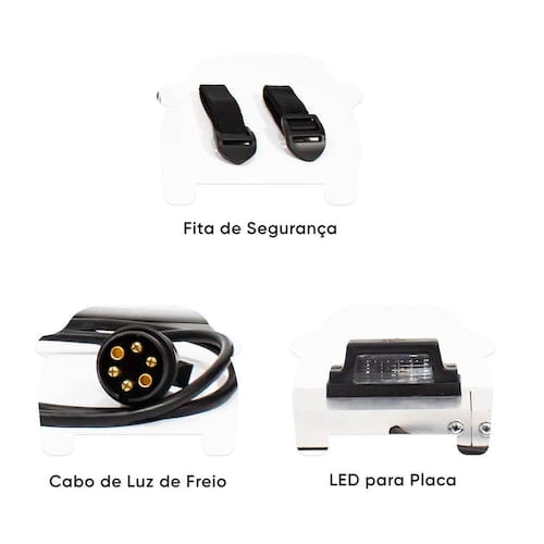 Características: Produto de excelente qualidade; Lanternas de sinalização com lâmpadas de led; Local para placa com iluminação e furação para a placa; Fixado na bicicleta ou suporte; Eva na parte traseira da régua para não arranhar sua bike; Acompanha lâmpadas leds instaladas; Faixas refletivas; Produto completo, com toda a instalação já realizada basta plugar na tomada Do engate ; Tipo de tomada: Plug macho 6 pinos mais compatível com os de 7 pinos; Prático e de fácil instalação; Régua bipartida; Indicado para suporte de bicicleta traseiro casos em que a visão da placa ou lanternas do veículo sejam obstruídas ; Acompanha ao equipamento a tomada para o engate e instalação elétrica padrão, conforme as normas da abnt nbr iso 3732;