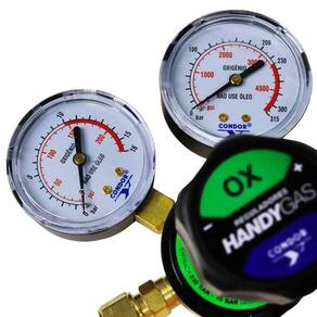 Regulador de Pressao para Oxigenio Handygas Condor 10 OX - 0410140 Regulador de 1 estágio para cilindros. Equipamento destinado a reduzir a alta pressão dos reservatórios de gases cilindros , ou de uma tubulação, para adequar as pressões requeridas pelo equipamento e trabalho. É um instrumento projetado para ter compatibilidade apenas com o gás a qual foi desenvolvido, e sua presença é essencial para o funcionamento correto do sistema oxi-combustível. Ideal para a maioria das aplicações industriais de corte, solda e aquecimento. Conformidade com as normas EN/ISO/ABNT. Especificações: Pressão Max Entrada bar P1: 230. Pressão Máx Saída bar P2: 10. Pressão Entrada Crítica bar P3: 21. Manômetro Baixa Pressão bar : 16. Manômetro Alta Pressão bar : 315. Vazão Máx m/h Qmax/Qcritica: 155/54. Imagens Meramente Ilustrativas Marca: Não Informado