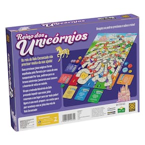 Contém: 1 tabuleiro, 6 cartelas, 6 peões, 1 dado, 1 conjunto de moedas cartonadas e 1 regra