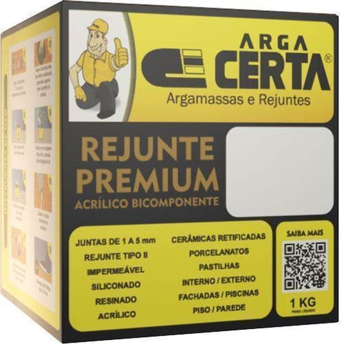 Indicações de uso: Áreas internas e externas; Pisos e paredes; Uso residencial e comercial; Juntas de 1 à 5mm; Porcelanatos; Pastilhas de porcelana ou de vidro; Cerâmicas com absorção de água maior ou igual à 3%; Pedras naturais; Banheiros, cozinhas e saunas; Cerâmicas assentadas em piso sobre piso; Pisos ou paredes aquecidos; Piscinas. Não indicado para: Juntas maiores que 5mm; Lareiras, churrasqueiras ou frigoríficos; Locais sujeitos ao ataque químico; Aplicação tipo rejunte sobre rejunte. Marca: Arga Certa