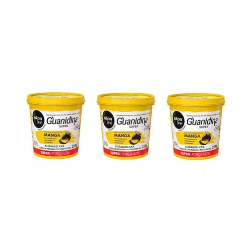 Salon Line Guanidina Óleo de Semente de Manga alisa, relaxa e reduz o volume dos cabelos, deixando-os mais lisos e soltos. Sua fórmula proporciona um resultado rápido e eficiente, além de conter Óleo de Semente de Manga, que hidrata, recupera e fortifica o fio. A Guanidina é compatível com Hidróxido de Sódio e Lithium, e incompatível com Tioglicolato de Amônia. Cuidado com colorações que contenham Amônia.