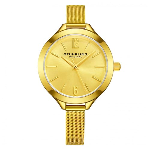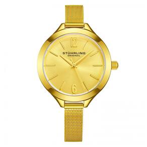 Este relgio possui um design elegante e sofisticado, com acabamento em tom dourado tanto na moldura quanto no mostrador. Os ponteiros e marcadores tambm seguem a mesma tonalidade, garantindo uma harmonia visual completa. A pulseira de malha tambm em tom dourado, complementando o estilo do relgio.