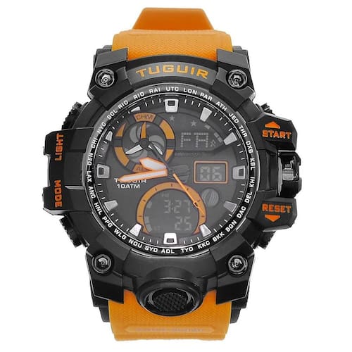 Relógio masculino 10atm analógico e digital com cronômetro, despertador, luz, resistente à água tg108 marca tuguir. Lindo relógio esportivo da marca que mais cresce no país. Design moderno e arrojado, que vai fazer com que você se destaque em suas aventuras e no dia a dia. Marca: tuguir categoria: analógico analógico: sim 1 horário ponteiros fluorescentes: sim digital: sim calendário: sim despertador: sim mostra o dia da semana: sim mostra o dia do mês: sim cronômetro: sim contador regressivo: não luz: sim cor da iluminação: verde resistente à água: 10 atm pode ser utilizado para mergulhar - respingos: sim - chuva: sim - lavar carro: sim - lavar louça: sim - natação: sim - mergulho: sim característica do vidro: acrílico tipo de fecho: fivela material da caixa: plástico formato da caixa: redondo diâmetro da caixa: 57,00 mm espessura da caixa: 19,00 mm material da pulseira: plástico largura da pulseira: 22,00 mm comprimento máximo da pulseira: 240,00 mm alimentação: bateria interna peso líquido: 0,073 kg modelo: tg108 garantia: 12 meses