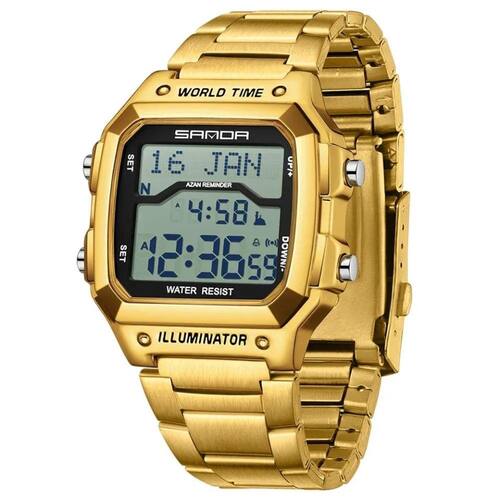 Prepare-se para elevar seu estilo e funcionalidade com este relógio digital de design arrojado. Criado para o homem moderno que valoriza precisão e um toque de sofisticação, este relógio de pulso oferece uma experiência completa. Seu visual impactante, com uma pulseira dourada e mostrador quadrado, o torna um acessório versátil para qualquer ocasião, complementando tanto o vestuário esportivo quanto o casual.