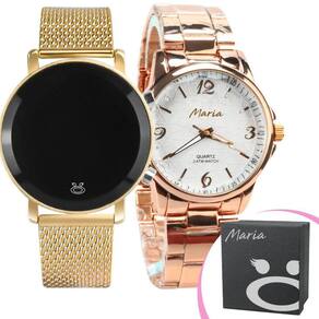 Relógio Aço Inox Rose Feminino + Relógio Digital Dourado Prensente Rose Social Ajustavel Conjunto de Relógios Femininos Orizom Maria - Analógico Rosê e Digital Dourado