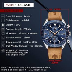 Relógios de qualidade 100% premium: oferecemos relógios masculinos com movimento de quartzo de qualidade 100% premium, com mostrador analógico e de data. Incrivelmente durável, pode durar uma vida inteira com uma manutenção adequada. Relógio com cronógrafo multifuncional com três submostradores para segundos, minutos e horas. Conforto e durabilidade: quando você precisa de um relógio para provar que valoriza o seu tempo. O relógio de pulseira de couro Aknight não apenas tem uma sensação confortável no seu pulso, mas também é fácil de combinar com suas roupas. Nossos relógios de pulso analógicos são perfeitos para o aventureiro e para o homem comum que está procurando uma combinação estilosa para sua roupa. Nossa paixão nos leva à perfeição, investindo horas e horas de trabalho para obter um produto final verdadeiramente incrível e exclusivo.