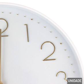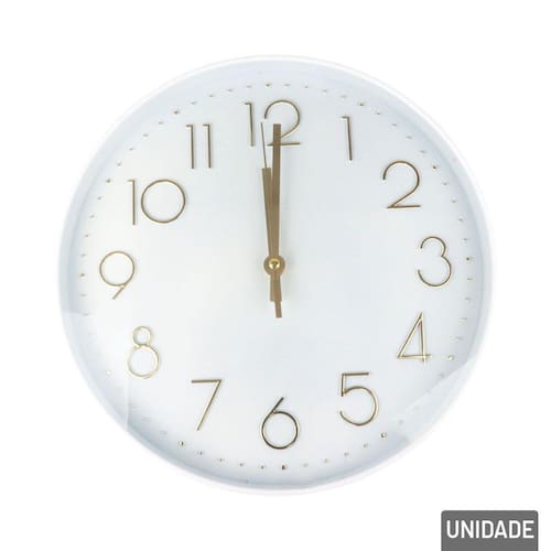 Relógio Analógico de Parede 29cm Redondo Br Decore com pontualidade! O Relógio Analógico de Parede de 29cm Redondo com designs de fundo branco e números grandes em dourado, é a escolha perfeita para quem deseja praticidade em ver a Hora, delicado e cheio de charme. Com estampas exclusivas que remetem a uma bela decoração, este Relógio é ideal para presentear ou decorar.\nSeu formato permite fácil instalação em diversos espaços, como quartos, salas, escritórios, consultórios ou cantinhos especiais do lar. O movimento analógico silencioso garante precisão sem ruídos incômodos, enquanto o visor com números bem definidos facilita a leitura das horas.\nUtiliza: 1x Pilha AA (Não Inclusa). Informação Adicional Marca : TINGS Tipo de material : Componentes Eletrônicos, Plástico Cores ou Estampa : Branco, Dourado Dimensões do Produto : 29 X 29 X 4 CM Dimensões da Embalagem : 31 X 31 X 4,5 CM Peso Bruto (Gramas) : 0.566 Marca: Não Informado