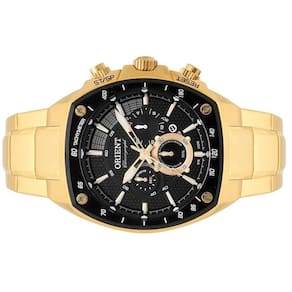 Cor do mostrador: Preto com detalhes, marcadores brancos com contorno dourados, ponteiros de horas e minutos dourados com branco na ponta, ponteiro de segundo inteiro dourado