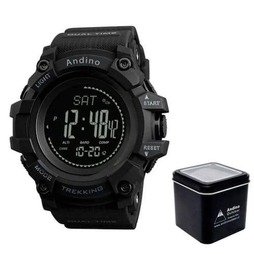 O modelo é de alta qualidade, ideal para o esporte e para o seu dia a dia, pois possui cronômetro e alarme. Também será um companheiro ideal em suas atividades esportivas com pedômetro. É feito de resina, por isso é muito resistente ao tratamento duro ideal para o seu trabalho diário ou tempo livre, pois possui um altímetro e um barômetro. Relógio de marca andina: Barômetro, altímetro, bússola, temperatura, entre suas principais funções, outras funções são detalhadas abaixo. Material da caixa: ABS e aço inoxidável\ nCom\ nMaterial:\ nResistência à água: 3ATM\ nTipo de fivela:\ nFivela\ nFunção: pressão dupla/hora/altímetro/distância/termômetro/previsão do tempo/bússola/pedômetro/calorias/quilometragem esportiva/armazenamento de dados/luz de fundo EL/12/24 horas/cronômetro temporizado/contagem regressiva/2 Grupo de alarme exibição de ps/semana/calendário. Características principais - Pedômetro - Altímetro - Barômetro - Bússola - Resiste à água (lavagem das mãos, piscina, chuva) - Termômetro - Alarme - Temporizador de contagem regressiva - Cronômetro - LED de iluminação INCLUI CAIXA E MANUAL EM ESPANHOL