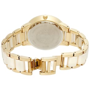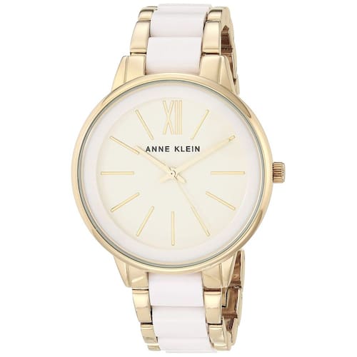 Anne Klein Relógio feminino com pulseira de resina, Marfim/Ouro, AK/1412IVGB - Relógio estilo namorado com marcadores finos de hora com logotipo impresso no mostrador central e elos centrais de resina marfim na pulseira - Caixa de metal de 37 mm com mostrador mineral - Movimento de quartzo japonês com mostrador analógico - Pulseira dourada e resina com fecho de joias - Resistente à água até 30 m: em geral, resiste a respingos ou breve imersão em água, mas não é adequado para nadar.