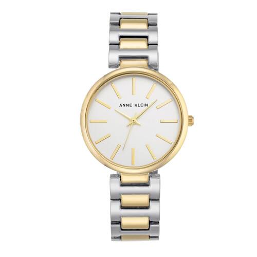 Anne Klein Relógio de pulseira feminino, Dois tons, AK/2787SVTT - Lente de cristal mineral; mostrador prateado com ponteiros e marcadores dourados - Pulseira de elos ajustáveis em dois tons; fecho dobrável com botão duplo de segurança - Movimento de quartzo japonês - Diâmetro da caixa: 34 mm - Não é resistente à água