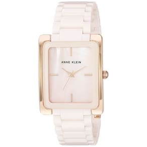 Relógio feminino com pulseira de cerâmica Anne Klein — Caixa retangular em ouro rosa com lente curva de cristal mineral; mostrador em madrepérola rosa claro com ponteiros e marcadores em ouro rosa claro — Pulseira de elos ajustáveis em cerâmica rosa claro; fecho e extensor de joias — Movimento de quartzo japonês — Pulseira de cerâmica com fecho de joalheria — Diâmetro da caixa: 28 mm