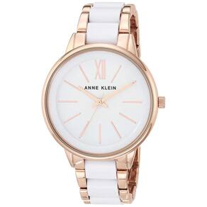 Relógio feminino de resina Anne Klein — lente de cristal mineral levemente abobadada; mostrador branco brilhante com ponteiros e marcadores em tom de ouro rosa — Pulseira de elos ajustáveis em tom de ouro rosa com elos centrais de resina branca; fecho e extensor de joias — Movimento de quartzo japonês — Diâmetro da caixa: 37 mm — Resistente à água até 30 m (99 pés): em geral, resiste a respingos ou breve imersão na água, mas não é adequado para nadar ou tomar banho