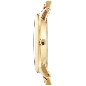 Relógio feminino com pulseira de resina Anne Klein — Lente de cristal mineral levemente abobadada — Mostrador vermelho brilhante com ponteiros e marcadores dourados — Pulseira dourada ajustável com elos centrais de resina estampada em crocodilo vermelho; fecho e extensor de joias — Resistente à água até 30 m (99 pés)