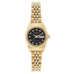 Armitron Relógio feminino com pulseira com detalhes de cristal genuíno, 75-2475, Dourado/preto, 75/2475BKGP - Bisel de borda de moeda; lente de cristal mineral - Mostrador preto com janela de calendário de dia/data; ponteiros luminosos dourados e marcadores de cristal premium; faixa de minutos externa impressa - Pulseira ajustável dourada e preta; fecho dobrável - O comprimento da pulseira pode ser ajustado entre 16 e 17,8 cm - Resistente à água até 50 m