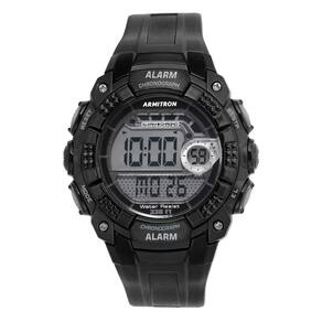 Relógio masculino Armitron Sport com pulseira de resina cronógrafo digital, 40-8209 — Estojo de resina preta com anel superior polido, gráficos impressos e movimento chinês. - Moldura metálica cinza e preta - Cronógrafo; alarme; cronômetro de volta; horário duplo; horário militar - Resistente à água até 330 pés (100 M)