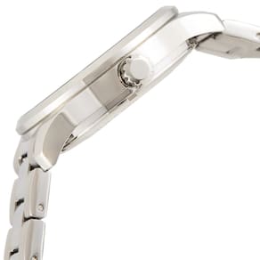 Caixa em aço inoxidável prateado com pulseira em aço inoxidável prateado.