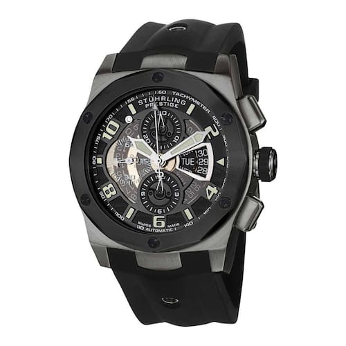 Este relógio Stuhrling apresenta uma moldura com acabamento escovado e parafusos em aço inoxidável. Com resistência à água de até 100 metros (330 pés) e tamanho de 47 mm, é um relógio robusto e durável. A correia de borracha de silicone de alta qualidade tem 26 mm de largura, proporcionando conforto e segurança ao usá-lo.
