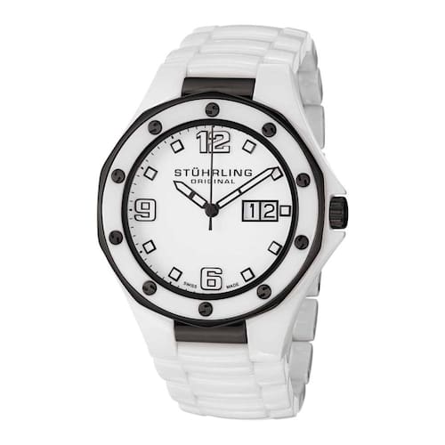 Este relógio Stuhrling apresenta uma moldura decagonal polida com parafusos e uma pulseira de ligação de cerâmica. Com um tamanho de 43mm, é resistente à água até 10 ATM ou 100 metros / 330 pés. Ideal para quem busca um relógio elegante e durável.