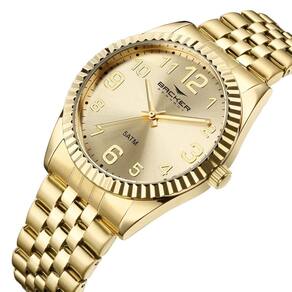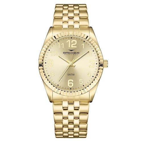 Relógio Backer Feminino Ref: 10303145f Ch Clássico Dourado DESCRIÇÃO DO PRODUTO: Caixa de Metal Pulseira de Aço Vidro de Cristal Mineral Fundo Resistente à Água 5 Atm Diâmetro / Largura da Caixa: 40.00 MM Funções: Analógico Design Alemão Alimentação do Maquinário: Bateria Mostrador champanhe com todos os números Maquina Japonesa de 1 ano Ean: 7897033049426